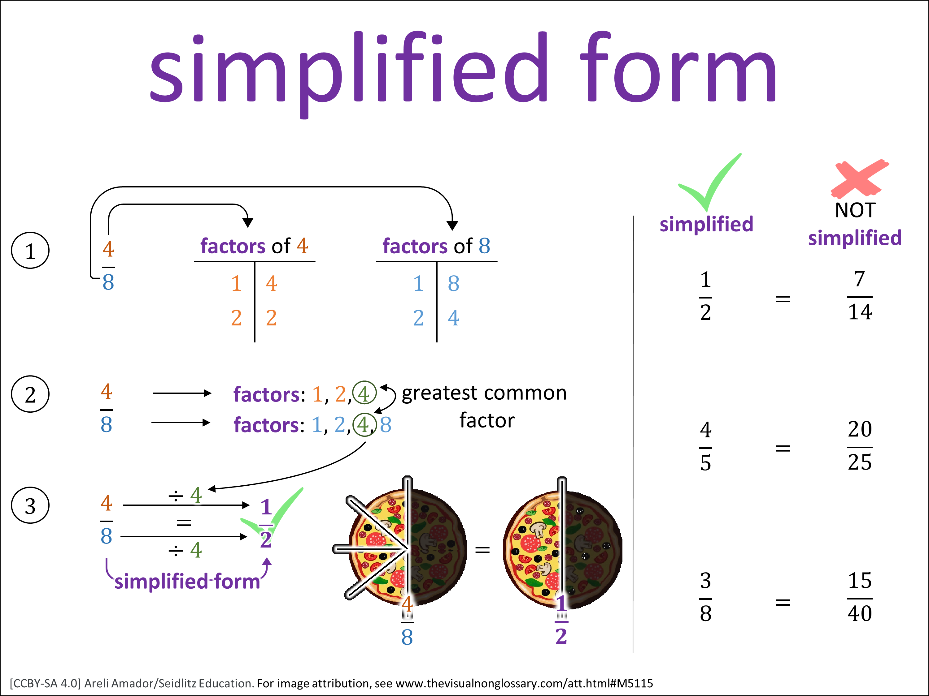 - The visual uses factors to reduce the fraction.