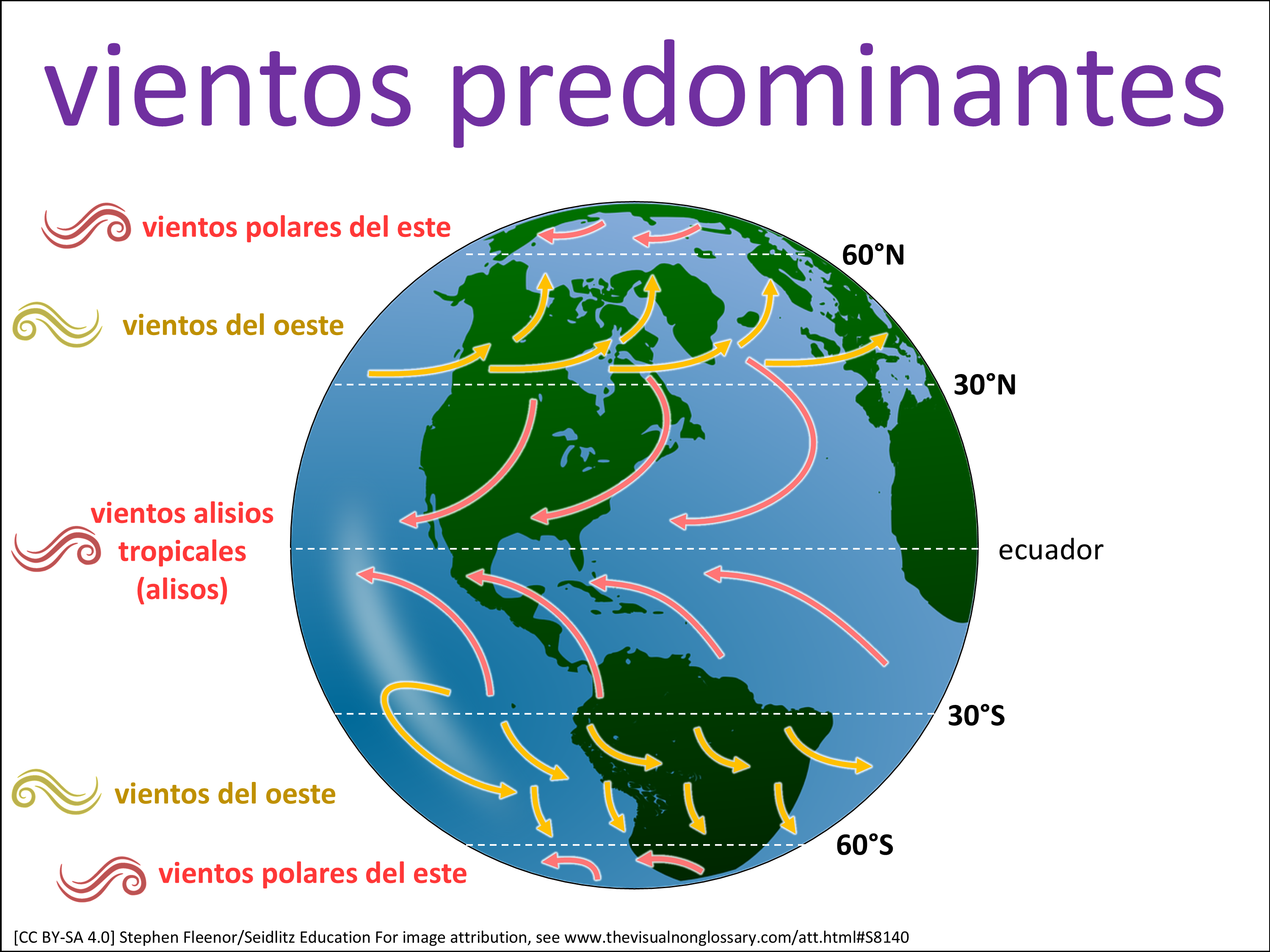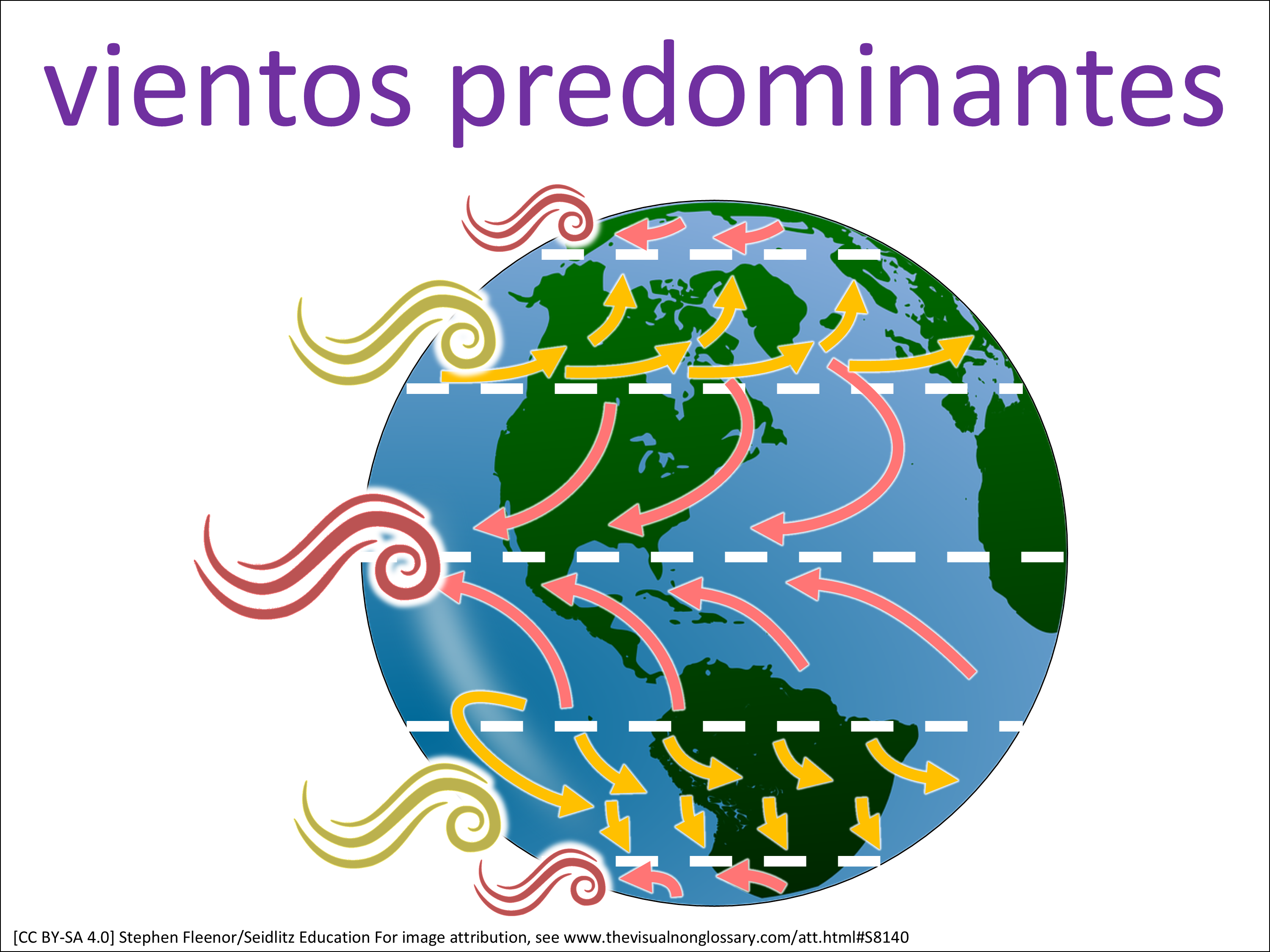 La distribución de los vientos predominantes en la Tierra está en diferentes lugares y direcciones.